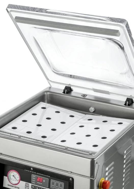 Profesionalni komorni vakuumski stroj za pakiranje živil in drugih izdelkov, primeren za mesnice, proizvodne obrate, restavracije, trgovine ter druge poslovne uporabnike, ki iščejo zanesljivo in učinkovito rešitev za podaljšanje roka trajanja, ohranjanje okusa, svežine in preprečevanje kontaminacij. Prostorna komora, izdelana iz kakovostnega nerjavečega jekla, s tesnilom, ki zagotavlja izjemno zrakotesnost. Ohišje in notranjost iz nerjavečega jekla (INOX), odpornega na korozijo in enostavnega za čiščenje. Vgrajeni elementi so zasnovani za trpežnost in dolgotrajno uporabo.