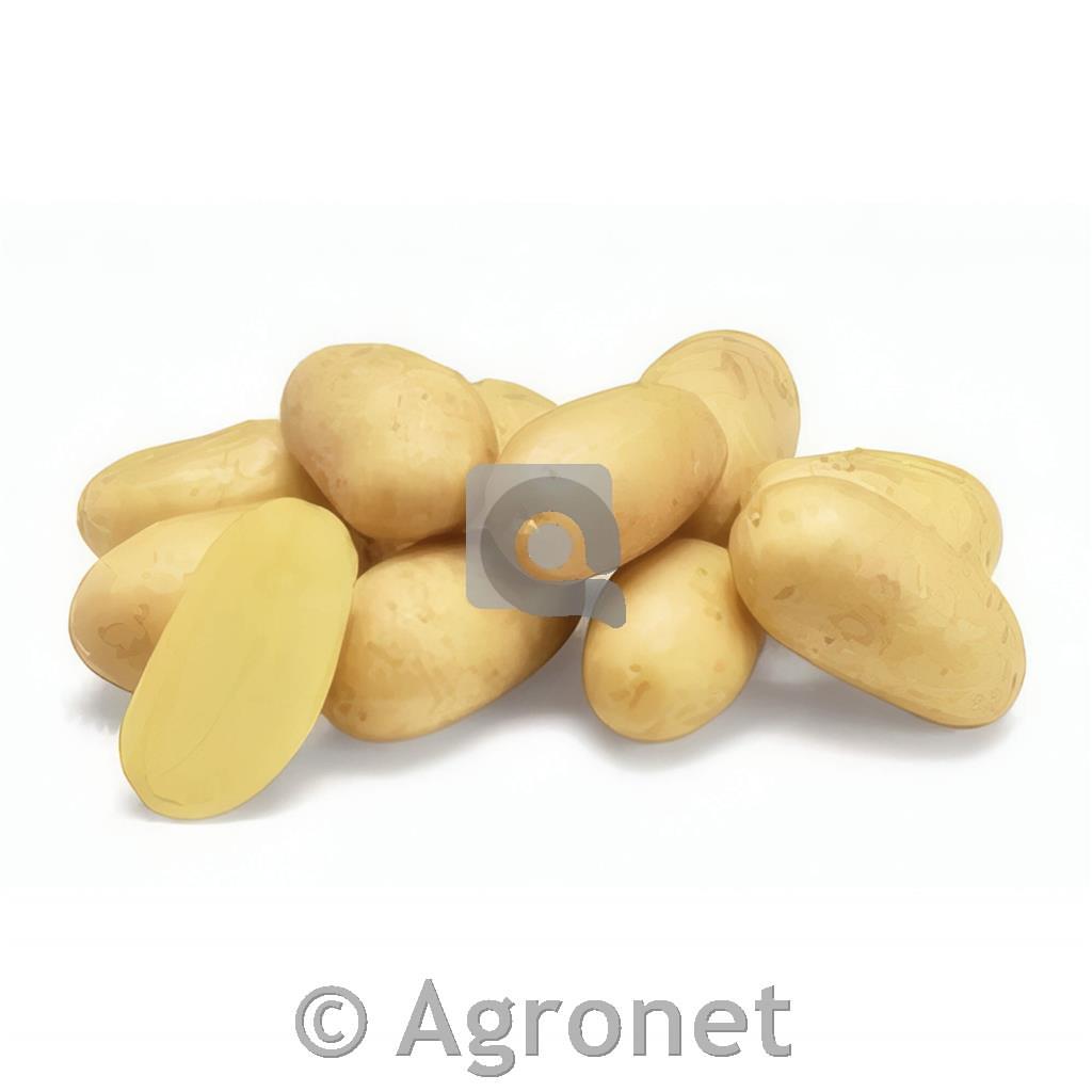 - Oblika gomoljev: Ovalna, nekoliko sploščena oblika z gladko rumeno lupino in svetlo rumenim mesom.