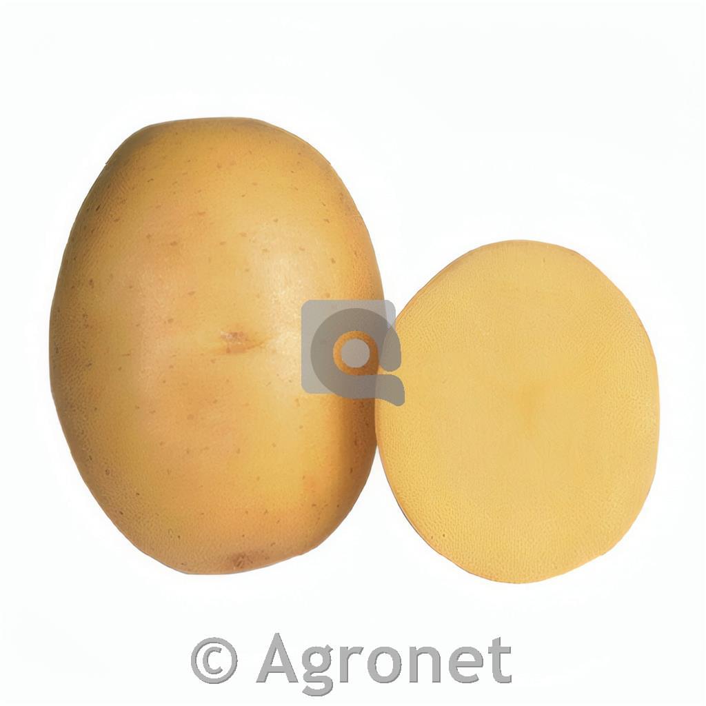 - Oblika gomoljev: Ovalna oblika, z gladko rumeno lupino in rumenim mesom.